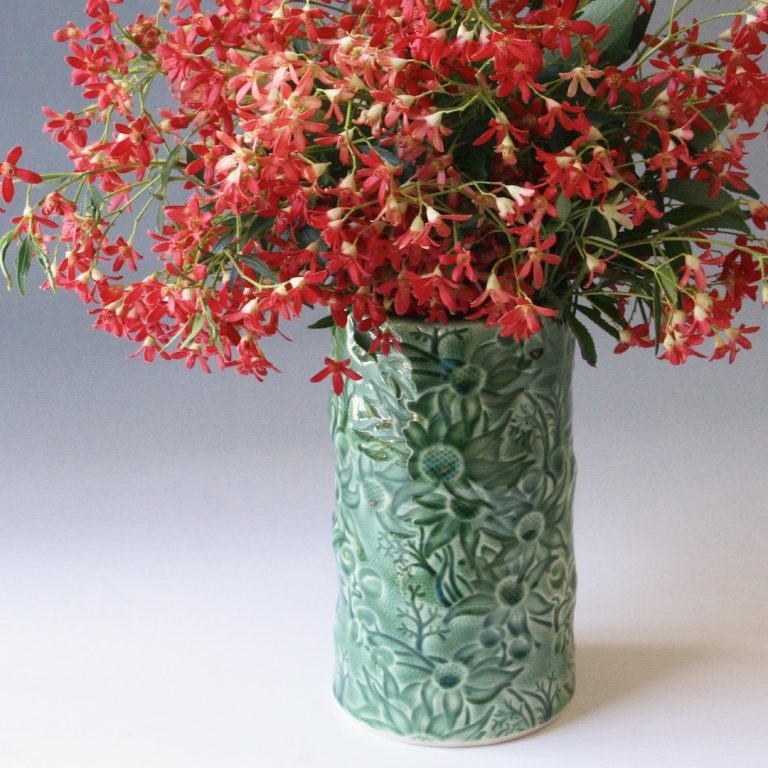 Brightly glazed ceramic tableware utilising texture, most notably a 100 year old Flannel Flower pattern sourced from a Federation House window.