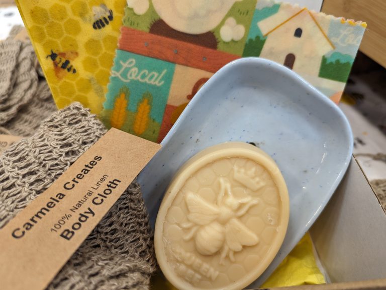 Carmela Creates makes beeswax wraps and soap using the honey and beeswax from her beehives. Her reusable waste free products are complimented with handmade ceramic soap dishes.