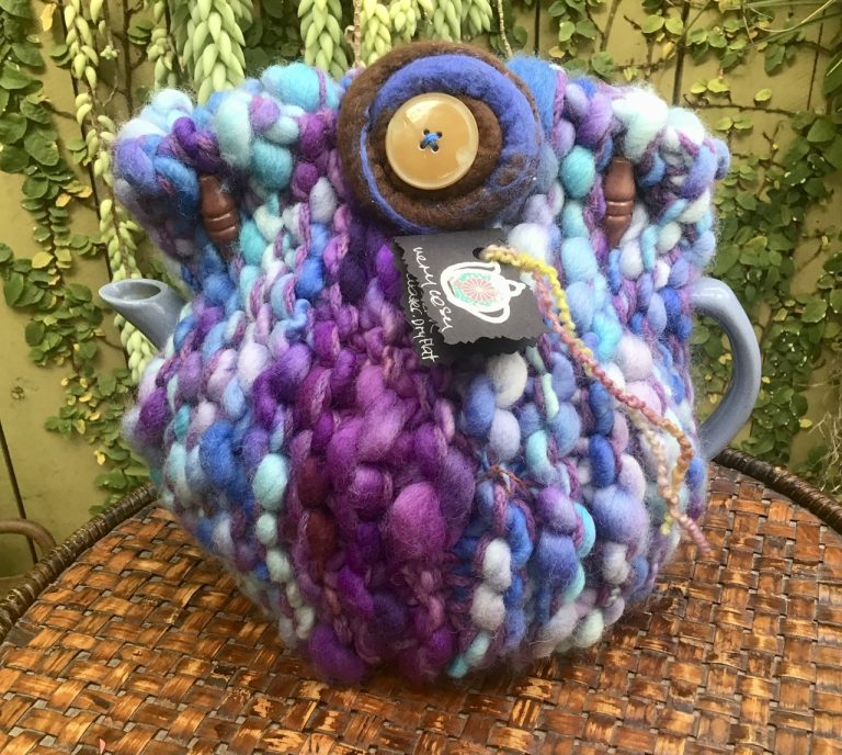 I am committed to using Australian artisan yarns where possible and love to combine different yarns and textures in my hand knitted or felted creations. I am also interested in vintage buttons and use them for embellishment on my tea cosies and brooches.