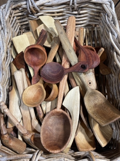 Spoons carved using hand tools from locally sourced woody weeds like privet and box elder.