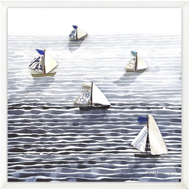 Hand-drawn and painted unique artworks each holding a salvaged fragment of vintage china or glass.